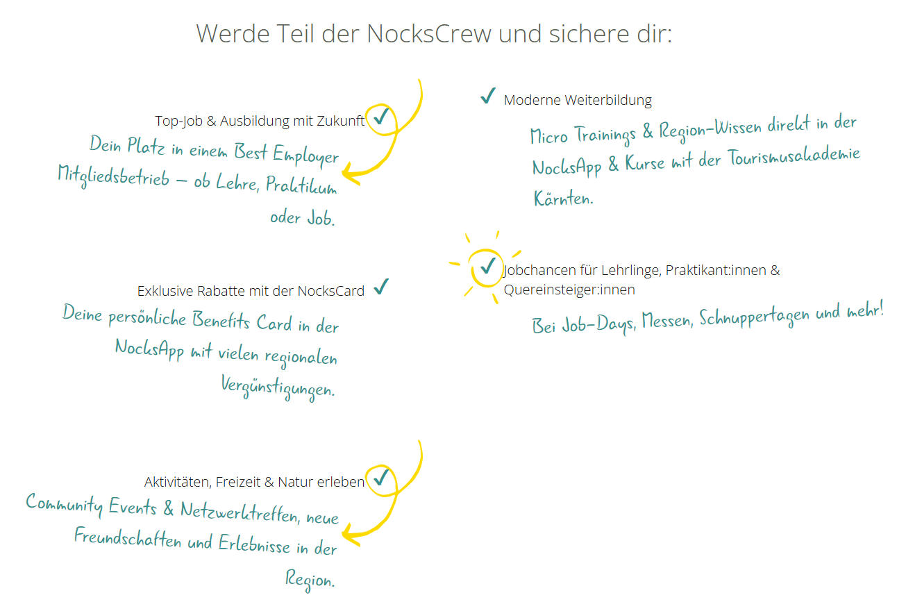 - NocksCrew: Unsere MitarbeiterInnen sind Teil der NocksCrew. So profitieren sie von exklusiven NocksCard Vorteilen mit vielen regionalen Vergünstigungen, umfassenden Fortbildungsangeboten der Tourismusakademie und können an zahlreichen Community Events und Netzwerktreffen teilnehmen.